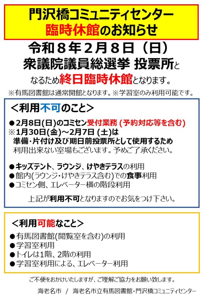 【重要】2月8日(日)門沢橋コミュニティセンター 衆議院議員総選挙 投票所による終日臨時休館のお知らせ