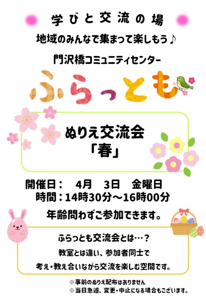 2026年1月9日 / 最終更新日時 : 2026年1月9日 kadokomi_staff イベント 2026/04/03 ふらっとも交流会~ぬりえ交流会~ 今回はぬりえ交流会「テーマ:春」♪ みんなで楽しくぬりえで交流しませんか? 〇ふらっとも交流会とは…〇 教室とは違い、参加者同士で考え・教え合いながら交流を楽しむ空間です。