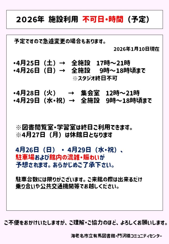 2026/04/25~ コミセン施設利用不可・時間(予定)のお知らせ