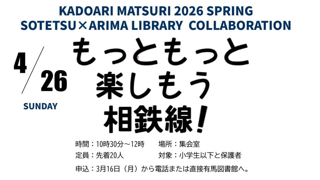 | 申込方法 | 3/16(月)よりお電話(046-238-4646)または有馬図書館カウンターにて受付中 |